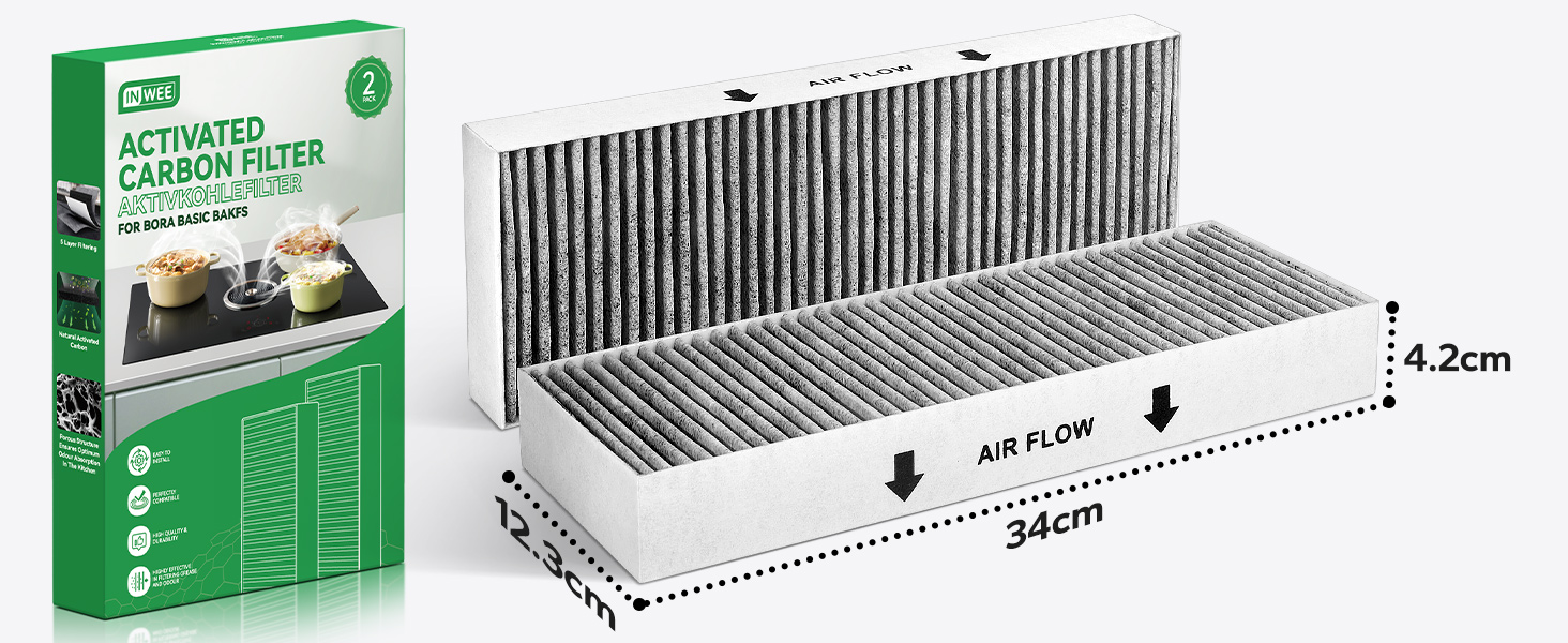 - Ідеально підходить для Bora Basic: фільтри з активованим вугіллям від Inwee ідеально підходять як заміна оригінальних фільтрів від Bora. Фільтр для вашої панелі Bora Basic з рециркуляцією типу BIU, BHU, BFIU, GP4U або BIAS, BHAS, BFIAS.