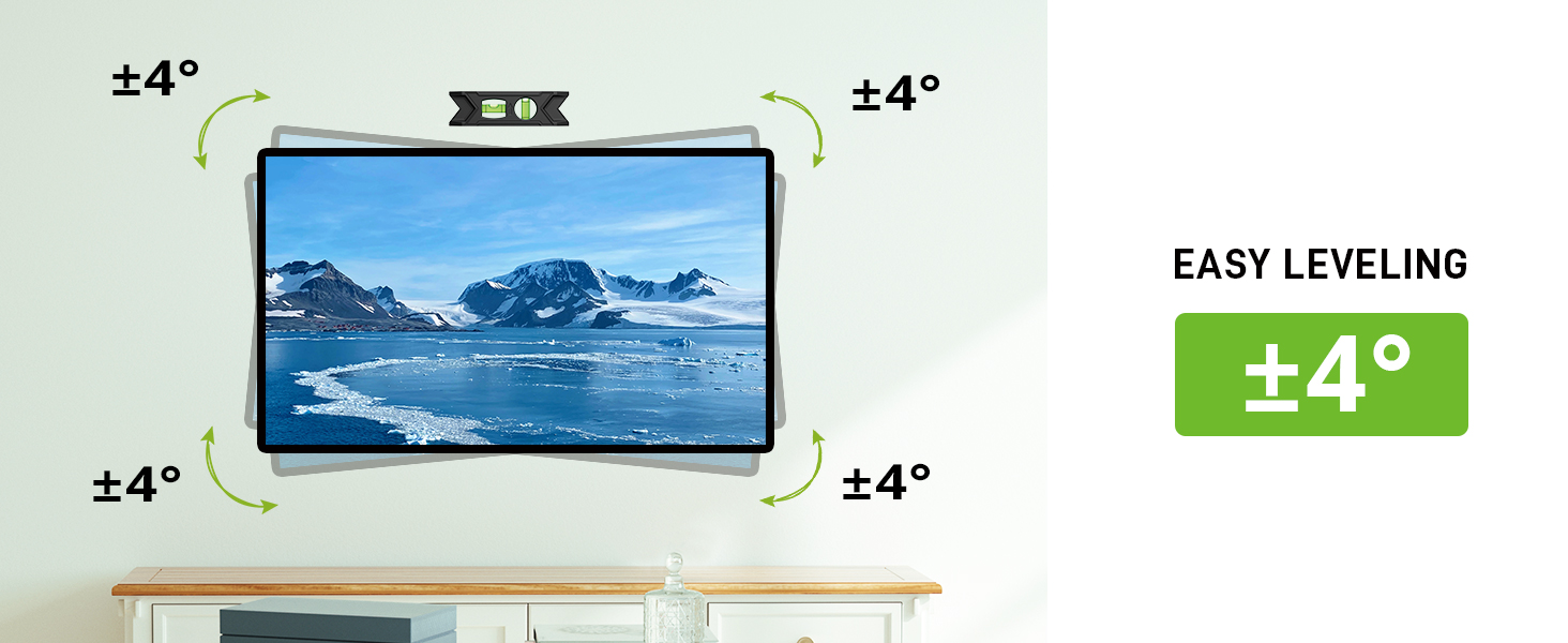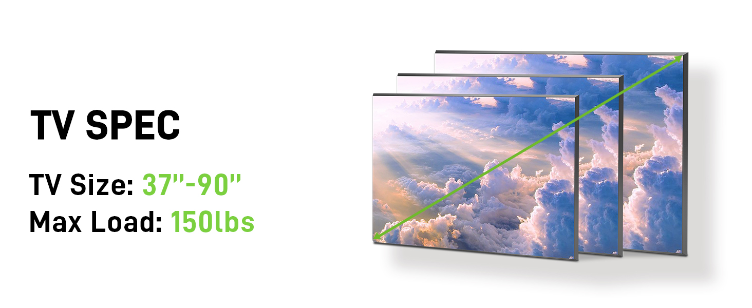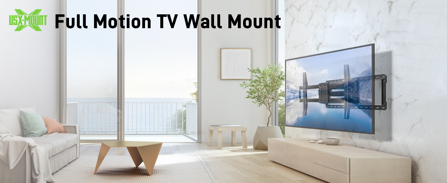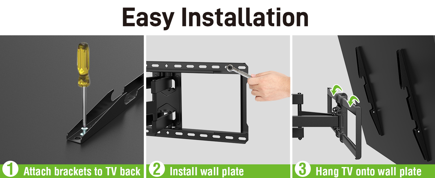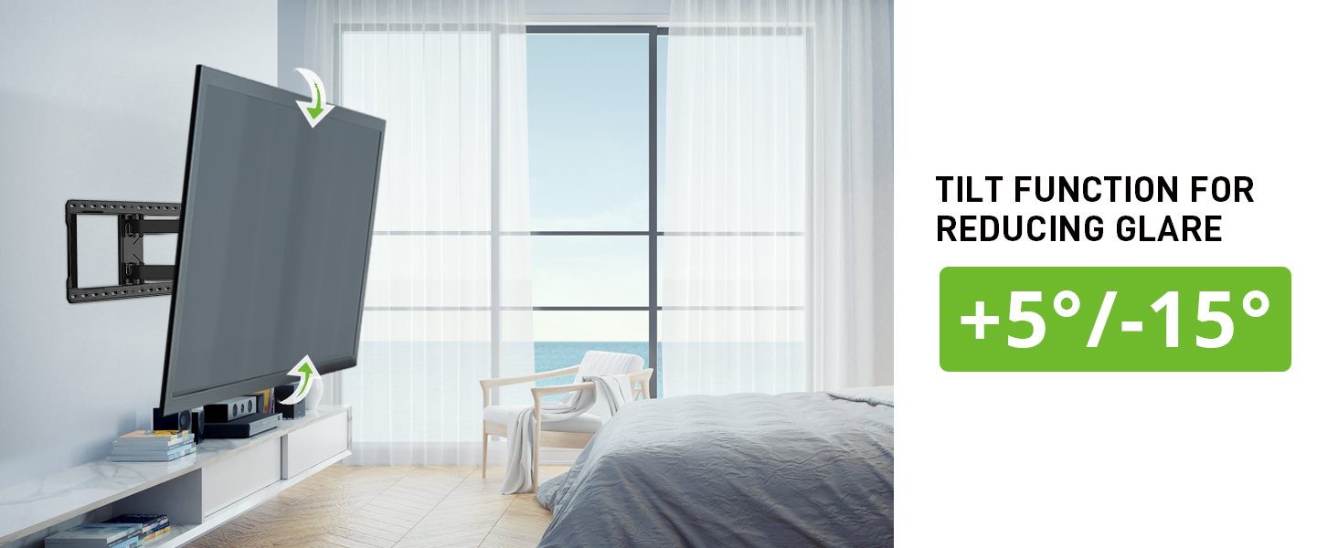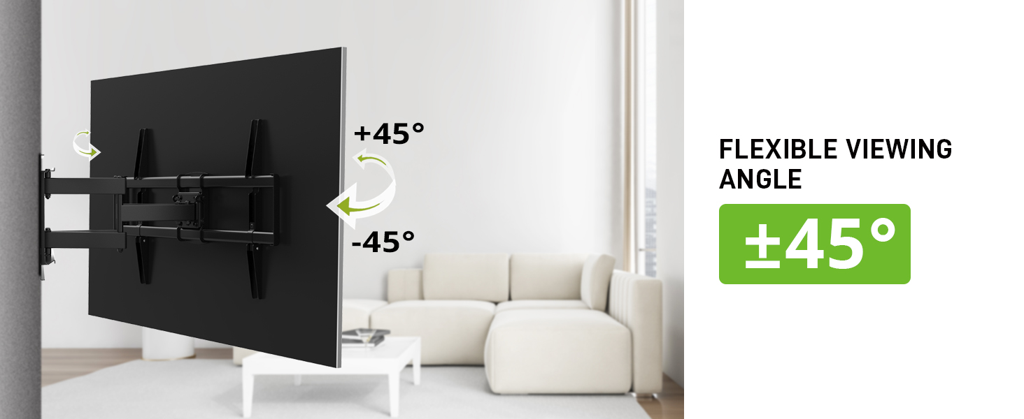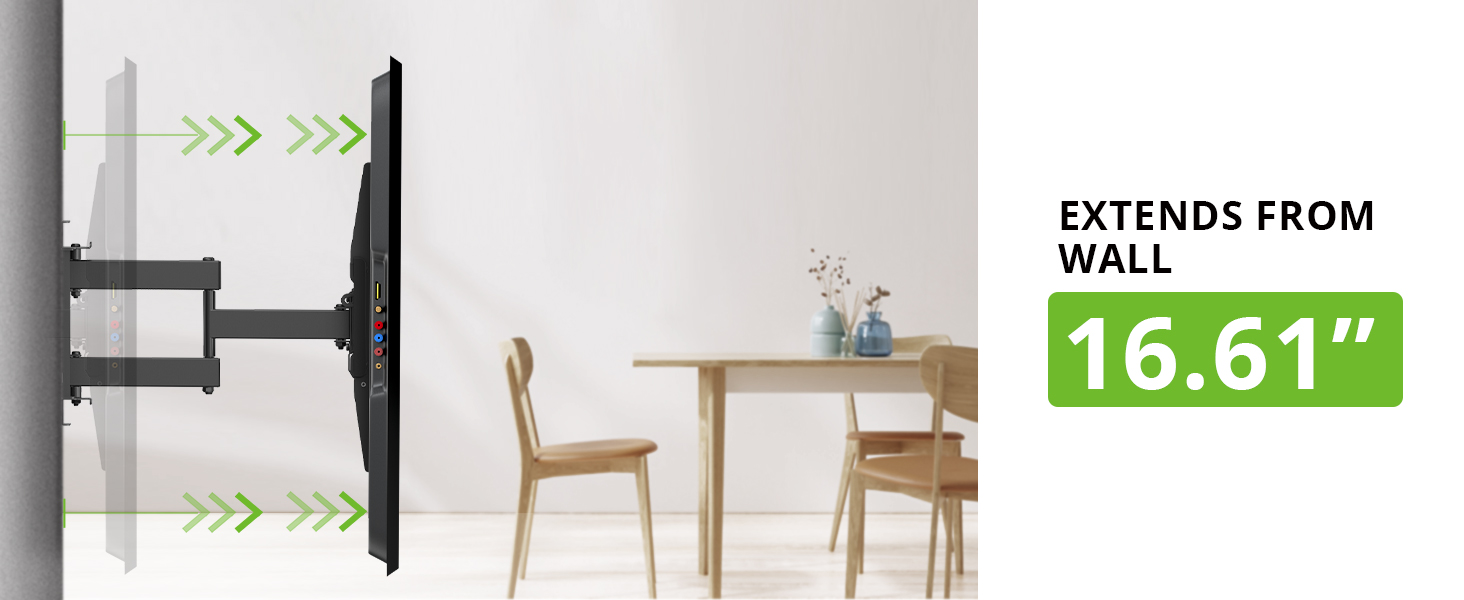 - Full Motion TV Mount: перемістіть телевізор гладко під будь-який кут, який ви хочете подивитися. Телевізійна брекет забезпечує вам +5/-15o нахил, +/- 45o поворот і вирівнювання +/-4o кути. Подовжує до 16,1 дюйма, втягується назад у низький профіль 2,5 дюйма.